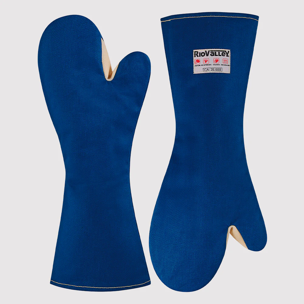 Luva de segurança confeccionada em tecido de algodão especial com tratamento retardante a chamas, forro destacável de feltro e tecido de algodão, com reforço de aramida entre o polegar e o indicador.